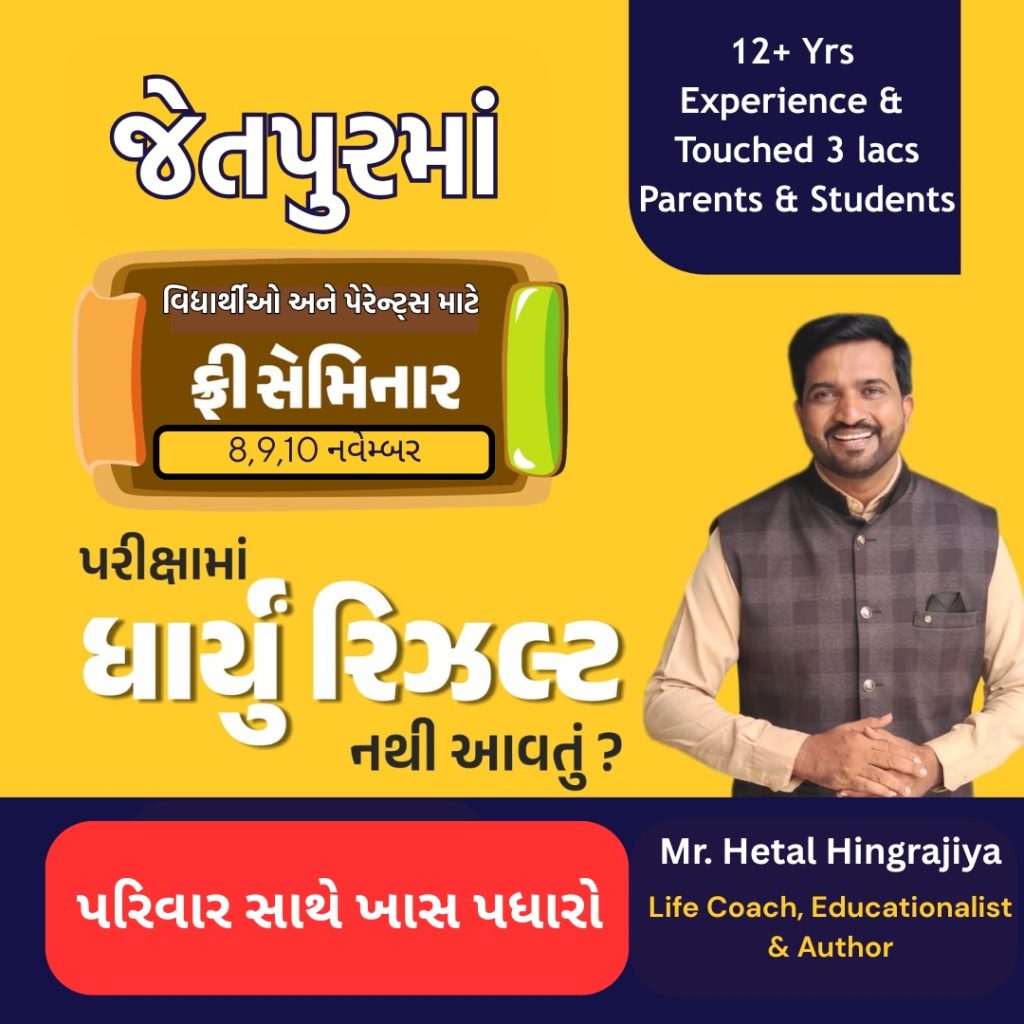 📚 આ “ફ્રી સેમિનાર” ધોરણ 5 થી 12 ના વિદ્યાર્થીઓ, સ્પર્ધાત્મક પરીક્ષાની તૈયારી કરતા સ્ટુડન્ટ્સ, ટીચર્સ તેમજ દરેક ઉંમરના પેરેન્ટ્સ માટે છે.